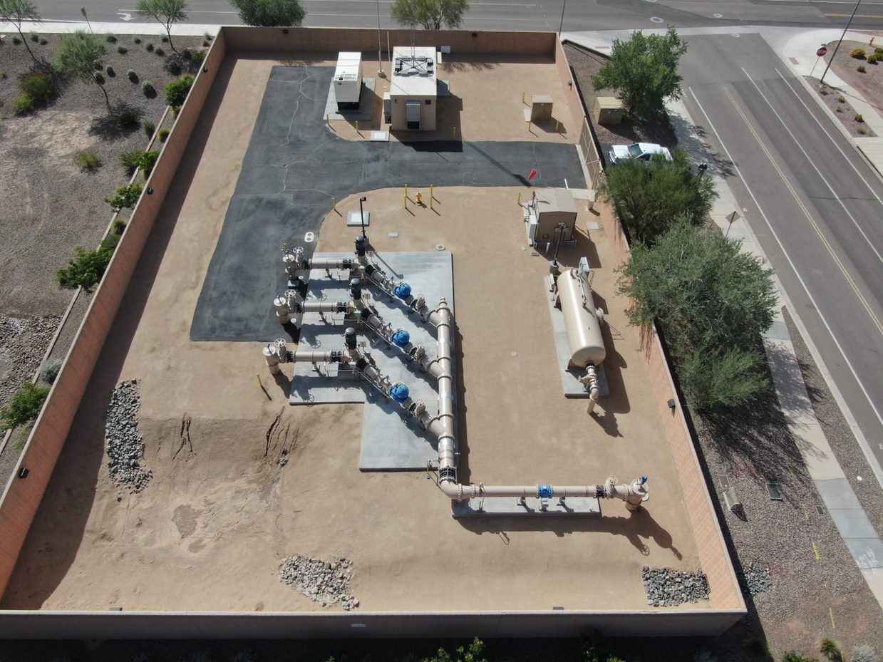 The Sonoran Mountain Ranch Booster Pump Station (6SMR B301 BPS) supplies water to the elevated Sonoran Mountain Ranch community to the site’s neighboring Aloravita Development and provides capacity planning for future developments along the Jomax corridor. The site consists of three (3) booster pumps, a 4,000-gallon surge control system, a chlorine disinfection system, an electrical building with a standby generator, and the site is powered by APS Service. There is a state-of-the-art Programmable Logic Controller (PLC) controlling the daily operations of the site, which is connected wirelessly and through fiber optic to the city-wide SCADA control system. Due to the site’s strategic location, it is utilized as a wireless communication relay station for numerous low-lying sites in the local area with restricted access.