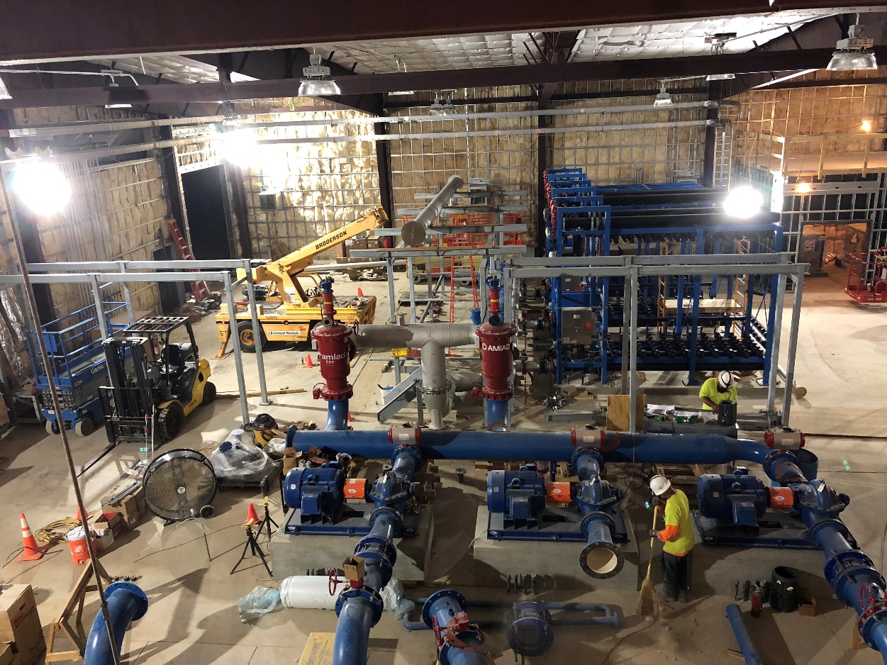 The project consisted of a 4 MGD membrane treatment plant with a 100 x 100 pre-engineered metal building with 1500 SF of tenant finish out; 30’ diameter, cast in place, concrete feed water tank; 30’ diameter, cast in place, concrete backwash clarifier, backwash recovery station, thirty 100 hp membrane feed pumps, two strainers, three PALL Transverse Membrane Racks with 54 modules per rack, clean in place system, neutralization system, two blowers, compressed air system, stainless steel water and air piping from 1” to 18”, a water lift station and 2,500 linear feet of 6” force main.